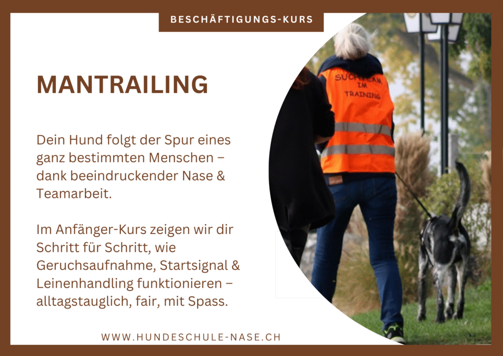 Dein Hund folgt der Spur eines ganz bestimmten Menschen – dank beeindruckender Nase & Teamarbeit. Im Anfänger-Kurs zeigen wir dir Schritt für Schritt, wie Geruchsaufnahme, Startsignal & Leinenhandling funktionieren – alltagstauglich, fair, mit Spass.