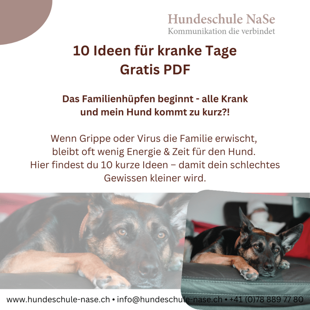 Wenn ein Virus durchs Haus geht, ist es normal, dass der Hund weniger Action bekommt. Das Gefühl der Schuld kommt von dem Bild im Kopf ‚so müsste es laufen‘ — doch Hunde sind erstaunlich anpassungsfähig. Kleine, gezielte Aktionen (z. B. 5–10 Minuten Nasenarbeit / Tricks) für den Kopf oder für die Muskeln reichen. Erfahre hier mehr.