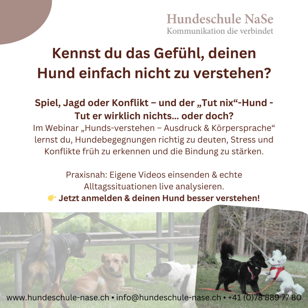 Hast du schon einmal nicht gewusst, was dein Hund dir sagen will? Dein Hund kommuniziert ständig – nur nicht mit Worten. Manchmal ist es ein Spiel, manchmal Stress oder Unsicherheit. Unsere Webinare helfen dir, Hundesprache, Ausdrucksverhalten und Alltagssituationen richtig zu deuten.